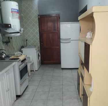 Cocina equipada con utensilios, vajillas, heladera, cocina a gas con horno y microondas.